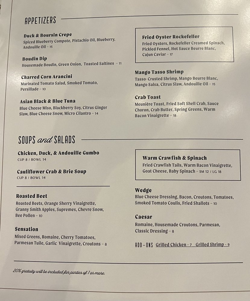 Since 1983, Fried Soft-Shell Crab, Seafood Stuffing, Creolaise Sauce, Yukon Gold Mashed Potatoes, Haricot Verts